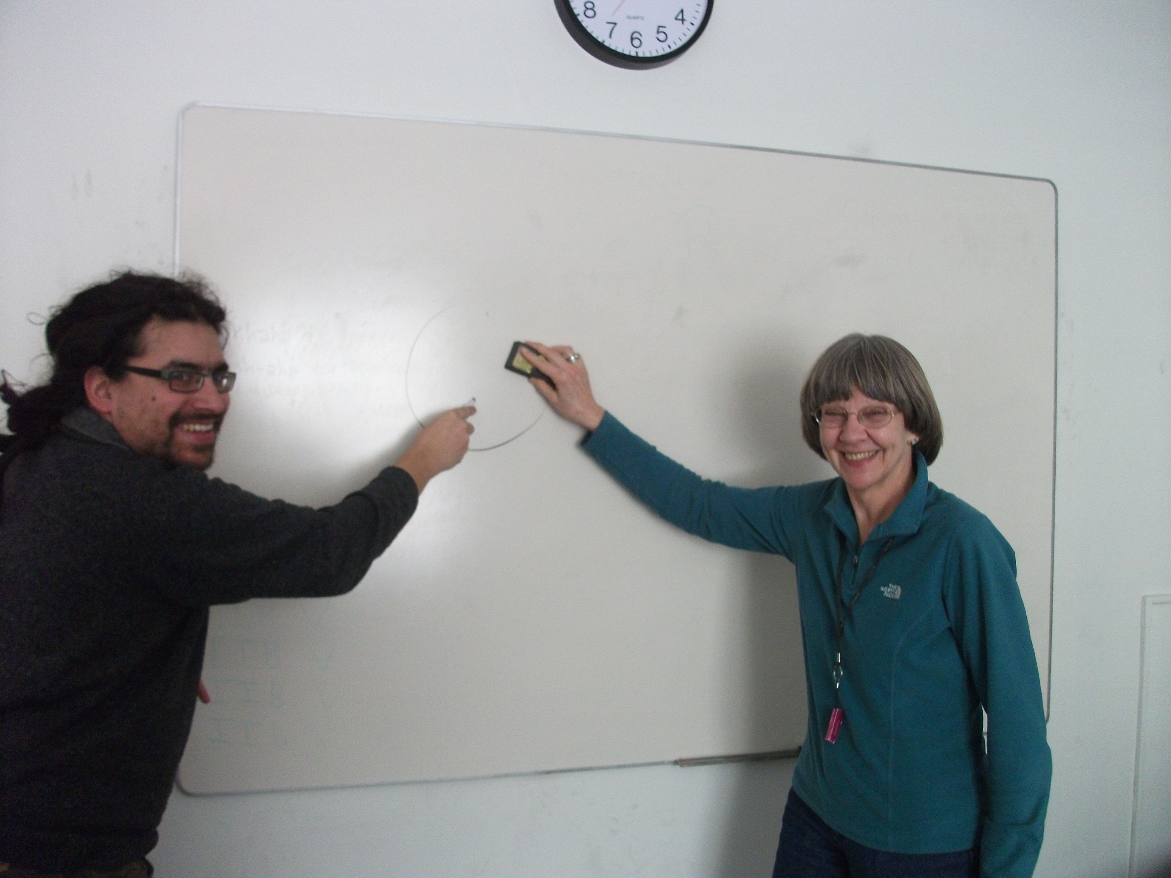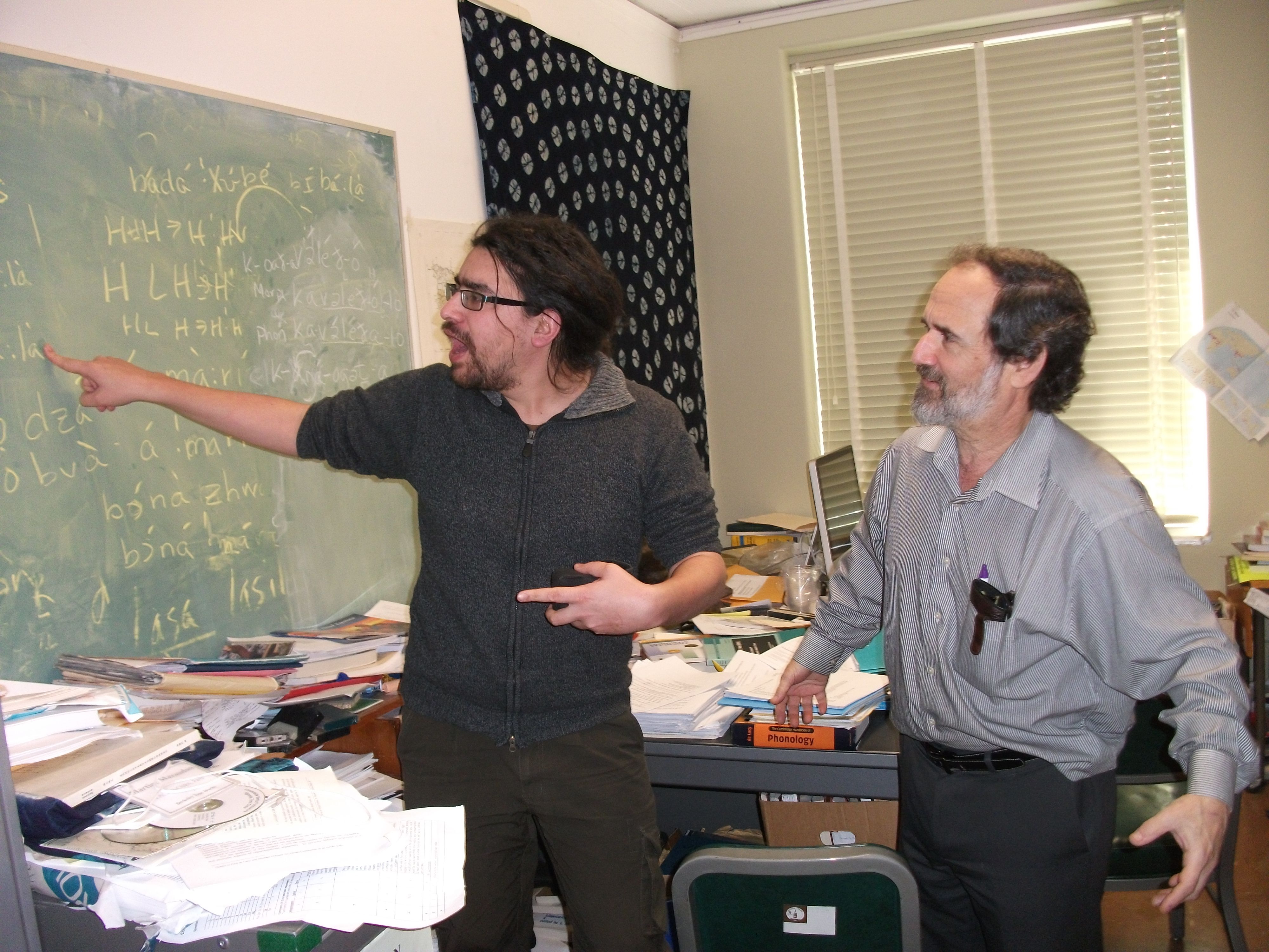 Explaining tone to Larry Hyman in Berkeley (2011).